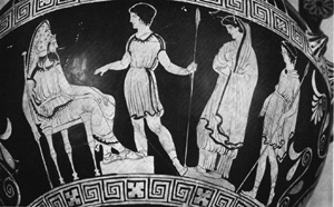 da due guardie viene portata davanti a Creonte (vaso del IV sec. a.C. conservato