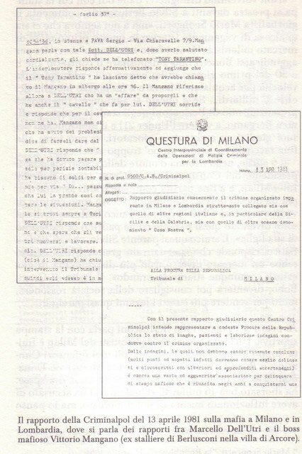 – Silvio Berlusconi dal 1974 al 1976 ospita nella villa di Arcore il noto mafioso, Vittorio Mangano, intimo del suo segretario Marcello Dell’Utri, già oggetto di denunce e arresti. Due arresti, effettuati proprio in casa del premier;