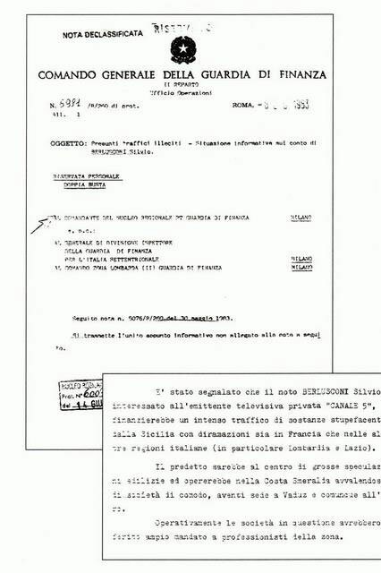 1983: la Guardia di finanza, nell’ambito di un’inchiesta su un traffico di droga, aveva posto sotto controllo i telefoni di Berlusconi. Nel rapporto si legge: «È stato segnalato che il noto Silvio Berlusconi finanzierebbe un intenso traffico di stupefacenti dalla Sicilia, sia in Francia che in altre regioni italiane. Il predetto sarebbe al centro di grosse speculazioni edilizie e opererebbe sulla Costa Smeralda avvalendosi di società di comodo…». L’indagine nel 1991 fu archiviata.