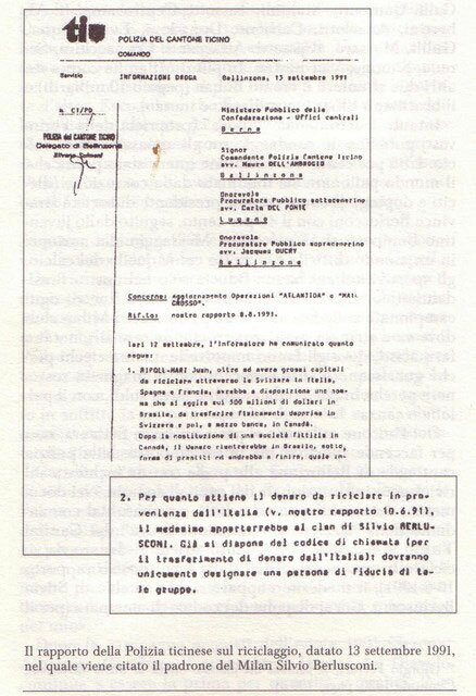 – Nel ’91 a Lugano, fallì una grossa operazione di riciclaggio di denaro e la procura federale, il comando di polizia e la procura ticinesi , fecero infiltrare nell’organizzazione il commissario di polizia ticinese Fausto Cattaneo, il quale nella sua relazione scrisse del coinvolgimento della Fininvest in grosse operazioni di riciclaggio;