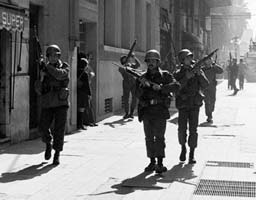La risposta della destra, nelle stesse vie riporta in piazza migliaia di donne, soprattutto della piccolo borghesia. Gridando “ Chile es-y sera’- Un pais de libertad” (Mi fa impressione. ricordarlo, adesso),ma anche “ Viaux, Viaux “ il nome di un generale reazionario imprigionato per sedizione dal 1970. Gruppi di giovani fascisti scatenano disordini per le vie del centro: li vedo accanirsi stupidamente contro vetrine e lampioni e scappare come lepri all’avvicinarsi dei carabinieri. In piazza della Moneda c’e una contromanifestazione di donne e giovani UP, malriuscita, poca gente. “ Non accettate provocazioni, lasciate fare ai carabinieri”. I giovani delle brigadas preparano alcune barricate difensive nella Alameda. Caschi, fazzoletti, limoni, (i gas lacrimogeni sono potentissimi, fabbricazione USA, altro che i nostri). I servizi d’ordine sembrano molti simili ai nostri.